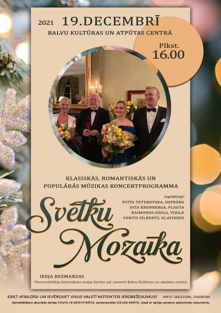 Svētdien, 19.decembrī plkst.16.00 Balvu kultūras un atpūtas centrāaicinām uz klasiskās, romantiskās un populārās mūzikas koncertprogrammu „Svētku Mozaīka”, kurā skanēs gan populāru operu un operešu ārijas, gan mūziklu un teātra mūzikas izcili paraugi, gan atpazīstami instrumentālās mūzikas opusi. Koncertprogrammu atskaņos Evita Teterovska (operdziedātāja), Dita Krenbrega (flautiste), Raimonds Ozols (vijolnieks) un Ventis Zilberts (pianists). Pateicībā un sadarbībā ar Balvu novada pašvaldību aicinām uz koncertprogrammu „Svētku Mozaīka”, ko vēlamies dāvināt visiem 3.adventā ieskandinot Ziemassvētkus un gaidot Jauno gadu.