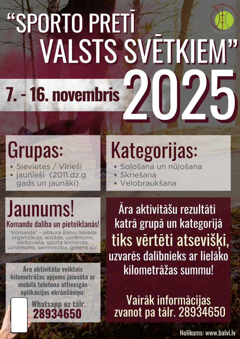 Tuvojas novembris- valsts svētku mēnesis, tāpēc aicinām ieplānot dalību sportiskās aktivitātēs "Sporto pretī valsts svētkiem"! Sacensības no 7. līdz 16. novembrim norisināsies 3 kategorijās - soļošana un nūjošana, skriešana, velo braukšana.