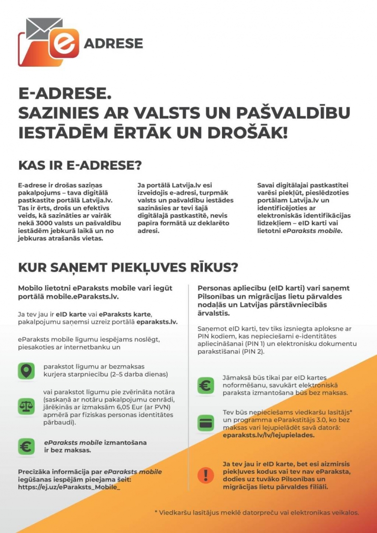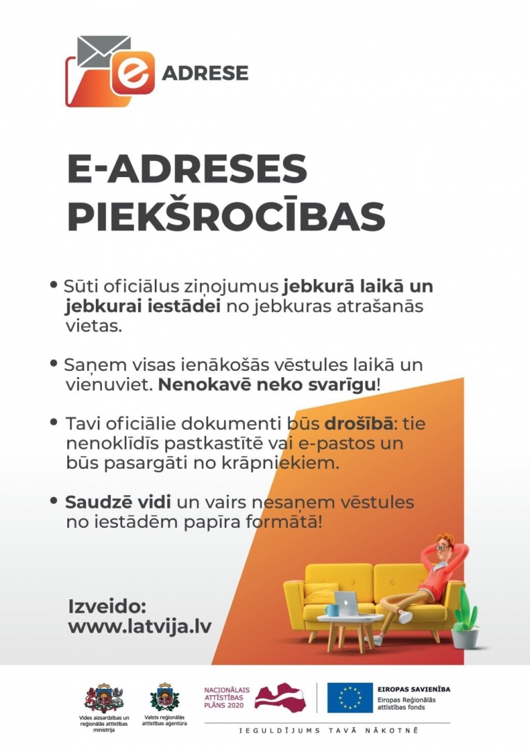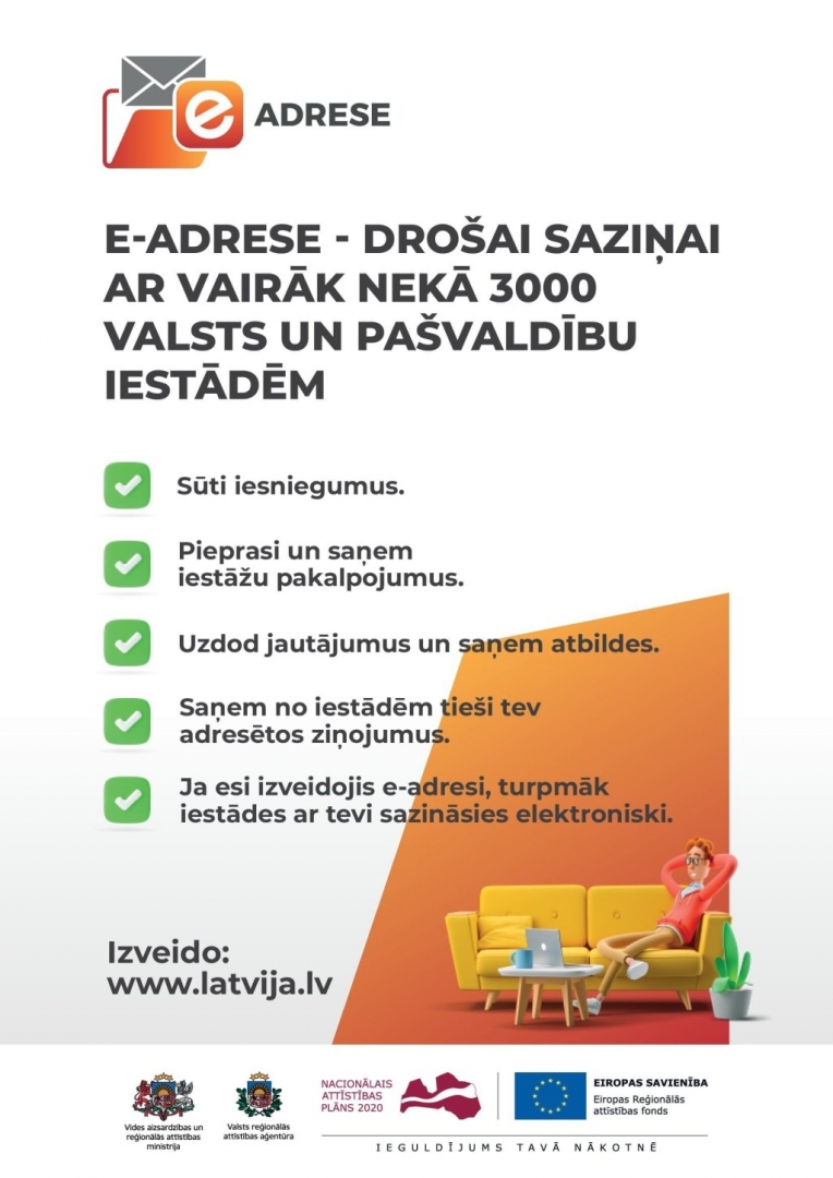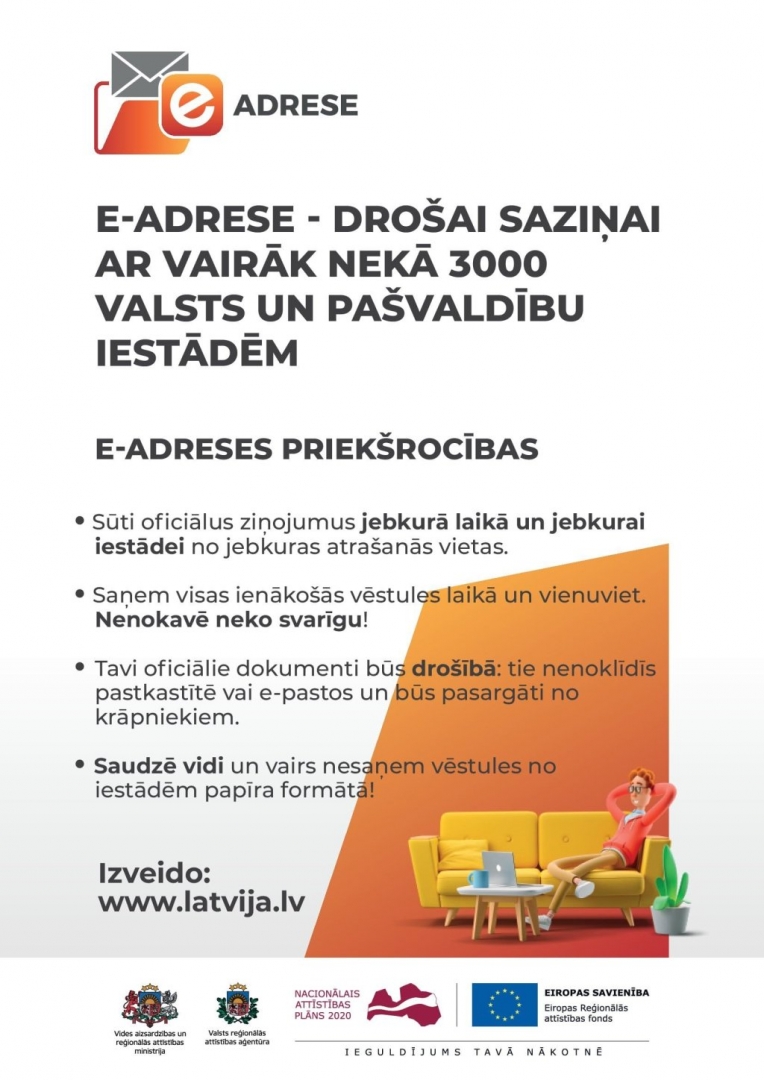 Kopš 2018. gada 1. jūnija iedzīvotājiem un uzņēmumiem ir pieejama oficiālā elektroniskā adrese (turpmāk – e-adrese). E-adrese ir drošs, uzticams un aizsargāts elektroniskas saziņas pakalpojums, ar kura palīdzību iedzīvotāji un uzņēmumu pārstāvji, izmantojot valsts pārvaldes pakalpojumu portālā Latvija.lv izveidotu kontu jeb pastkastīti, var veikt oficiālu, elektronisku saraksti ar valsts un pašvaldību iestādēm un otrādi.