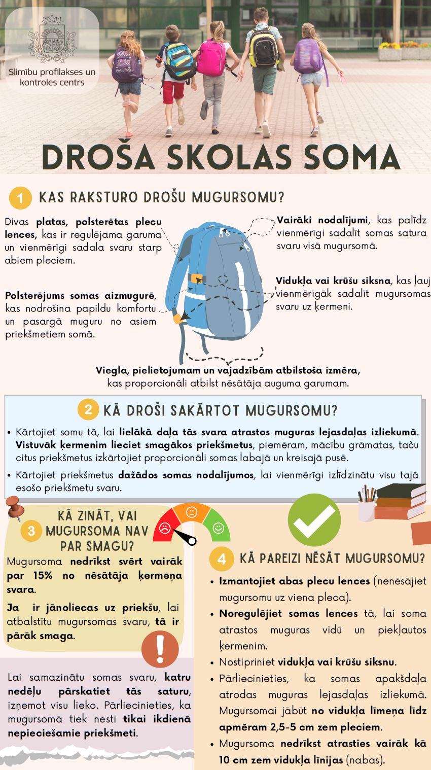 Slimību profilakses un kontroles centrs ir izstrādājuši samērā plašus ieteikumus, kas raksturo drošu mugursomu, kā droši sakārtot mugursomu, kā zināt, vai mugursoma nav par smagu, kā arī kā pareizi nēsāt mugursomu.
