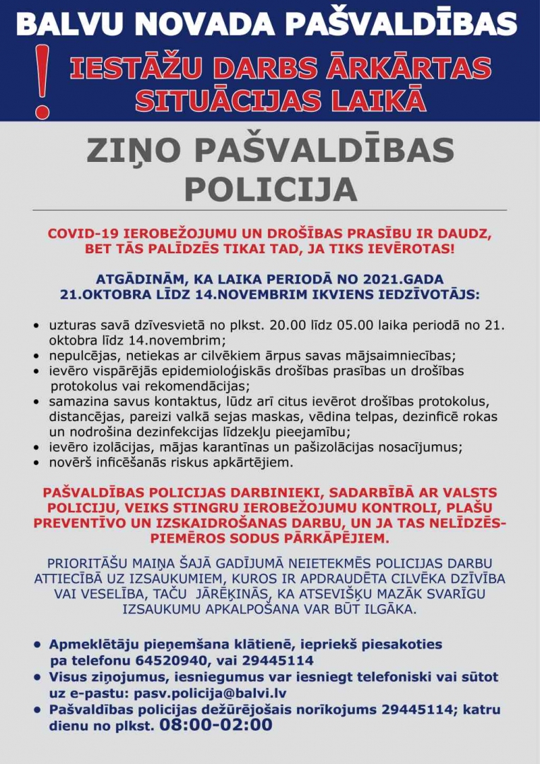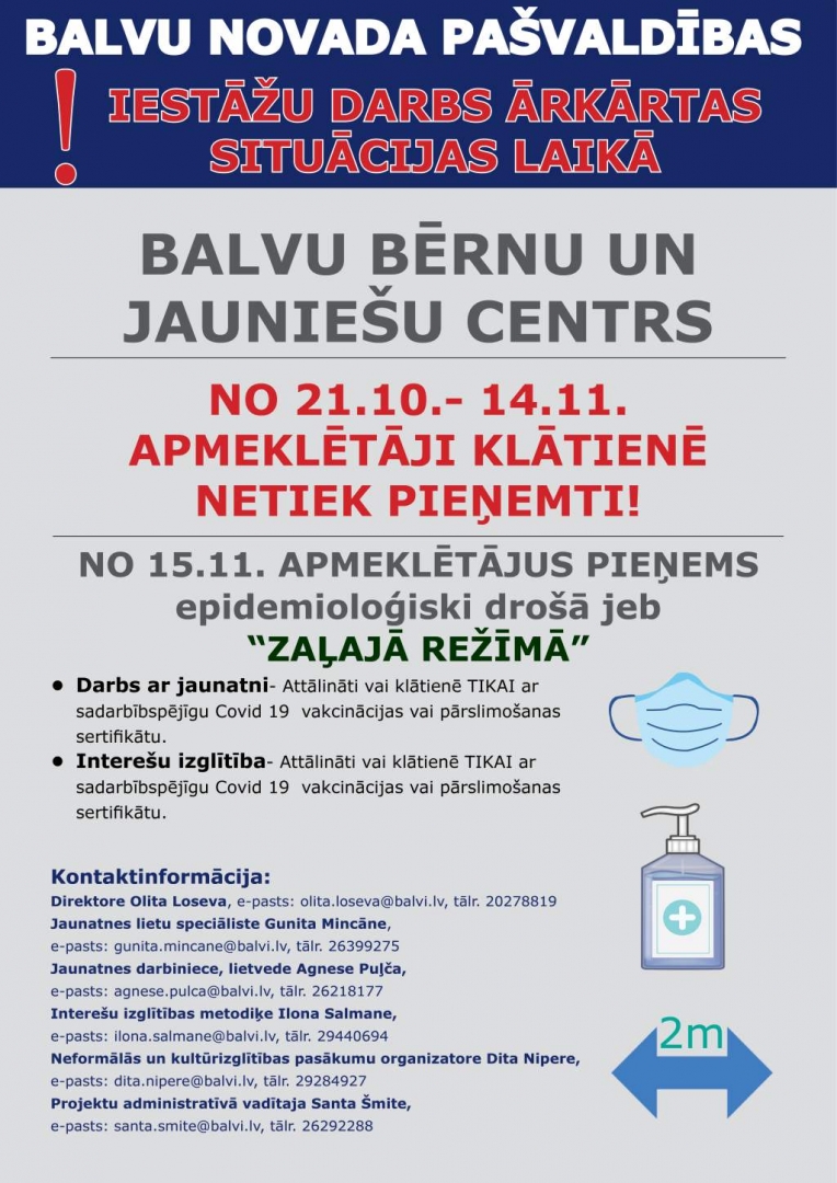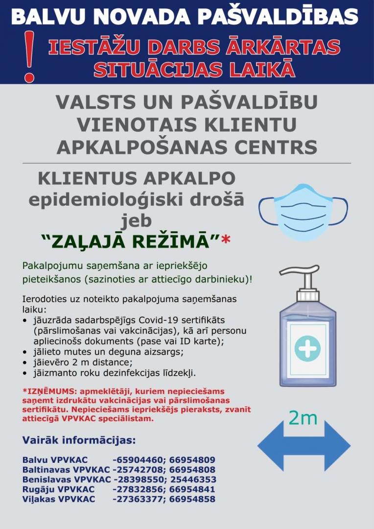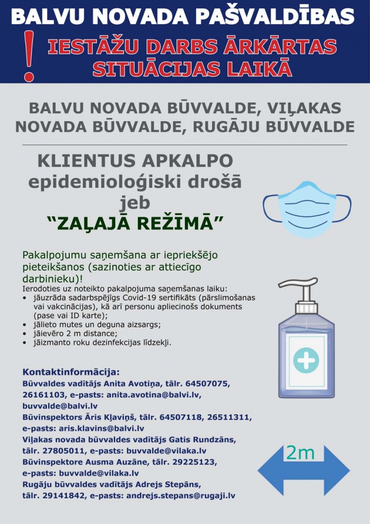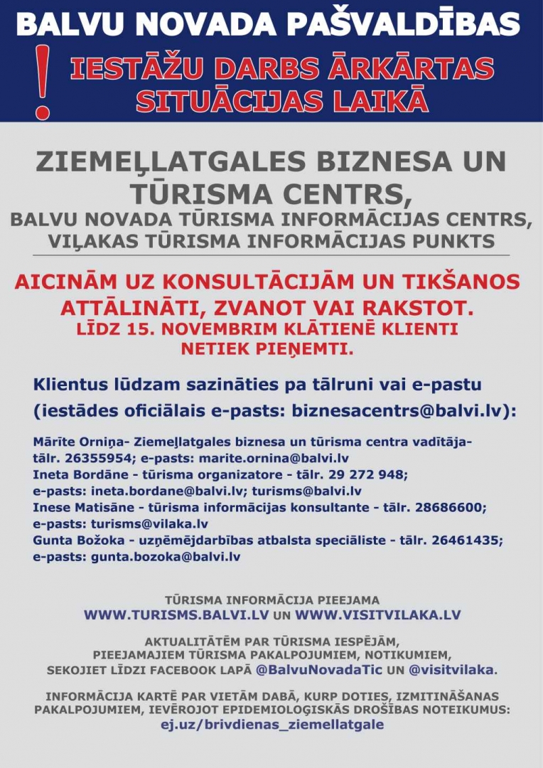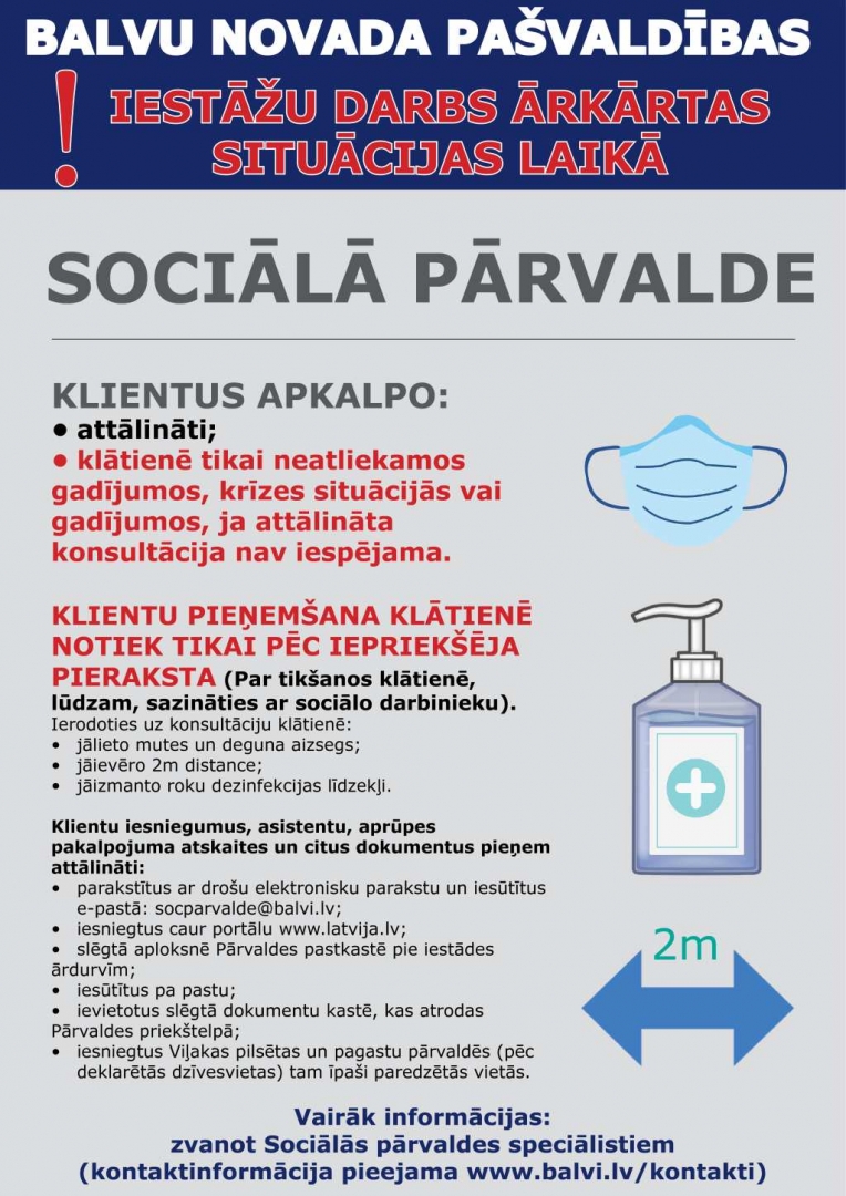 Lai iedzīvotājiem būtu vieglāk izprast Balvu novada pašvaldības iestāžu apmeklētāju pieņemšanu, pakalpojumu sniegšanu ārkārtas situācijas laikā, ir izveidoti informatīvie paziņojumi, kuros apkopota klientu vai apmeklētāju pieņemšanas kārtība un speciālistu kontaktinformācija.