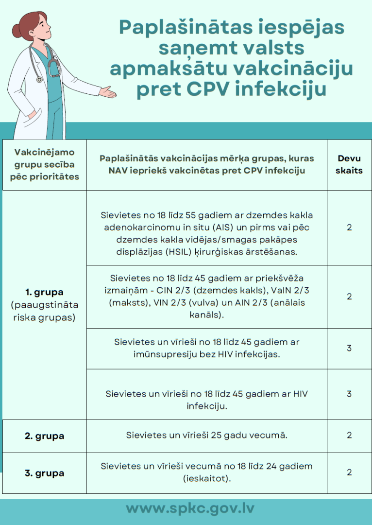 Līdz šim valsts apmaksāta vakcinācija pret CPV infekciju ir bijusi pieejama meitenēm un zēniem vecumā no 12 līdz 17 gadiem. Šī vecuma bērni arī turpmāk paliek prioritārā vakcinācijas grupa, tomēr ir veiktas izmaiņas, paplašinot valsts apmaksātas vakcinācijas iespējas atsevišķām iedzīvotāju grupām, kuras iepriekš nav vakcinētas.