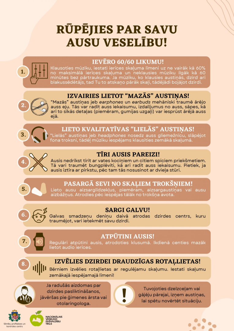 Pasaules dzirdes dienas ietvaros SPKC speciālisti izstrādājuši infografiku “Rūpējies par savu dzirdi”, kurā apkopoti ieteikumi, kā saudzēt dzirdi.
