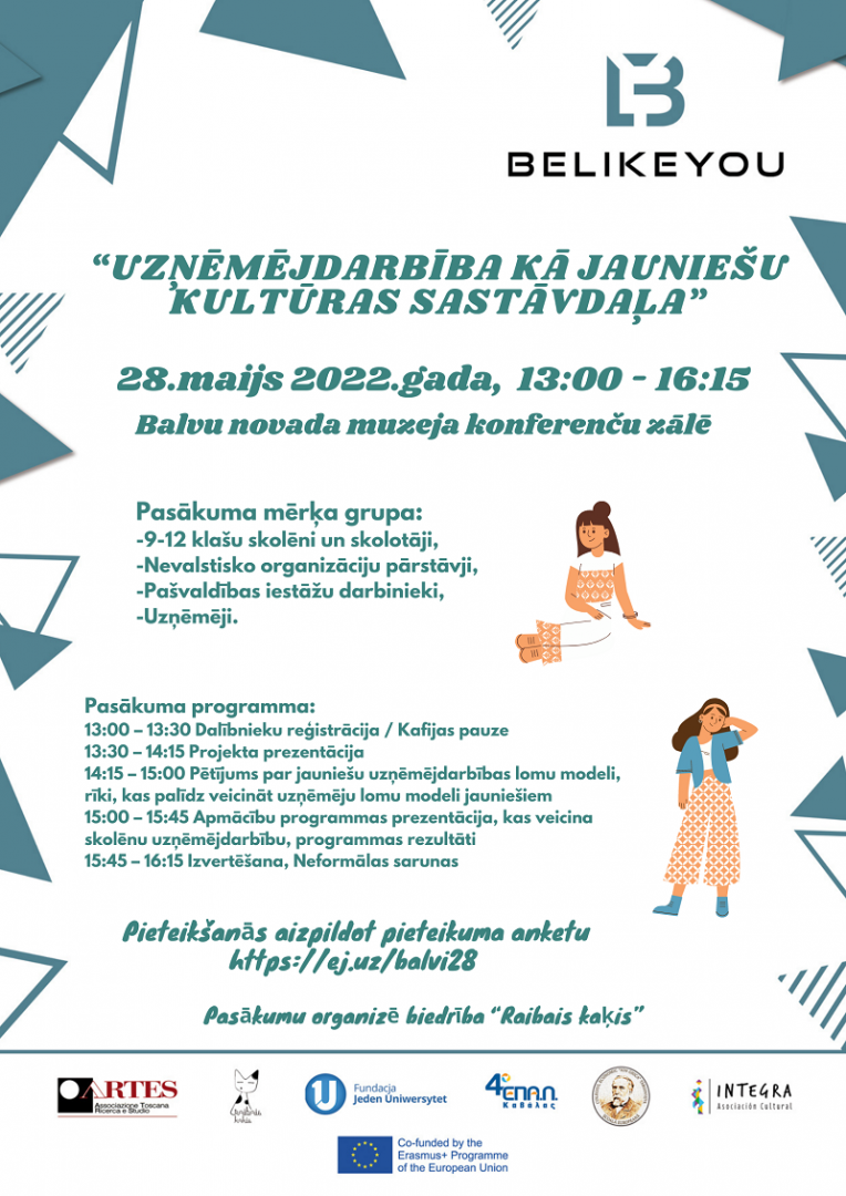 Starptautiskā projekta "Belikeyou", rezultātu izplatīšanas pasākums “Entrepreneurship as Youth culture” 2022.gada 28. maijā, Balvu novada muzeja konferenču zālē.