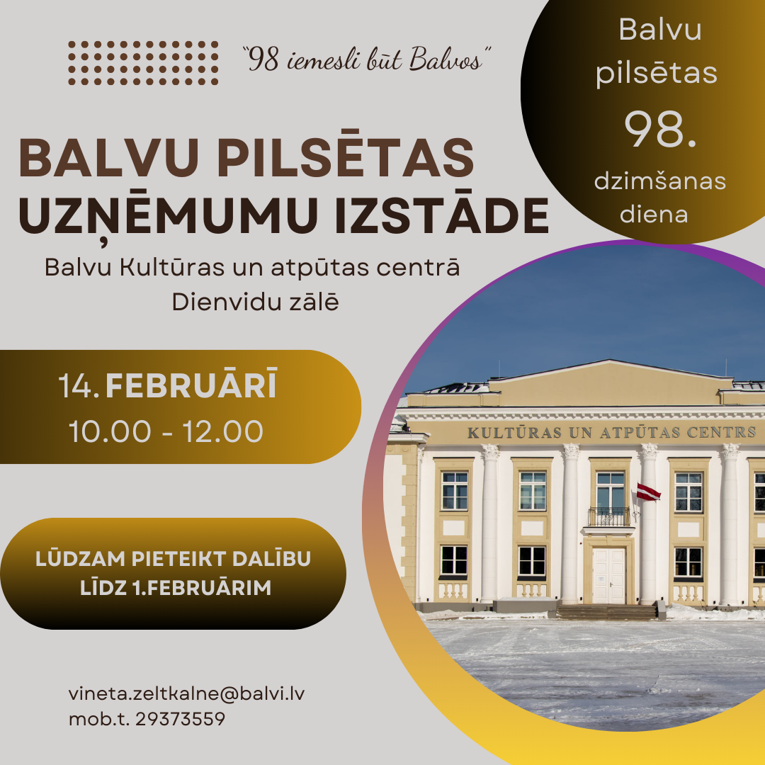 14. februārī plkst. 10.00 Balvu Kultūras un atpūtas centrā Dienvidu zālē - Balvu pilsētas 98. dzimšanas dienai veltīta Balvu pilsētas Uzņēmumu izstāde “98 iemesli būt Balvos”.