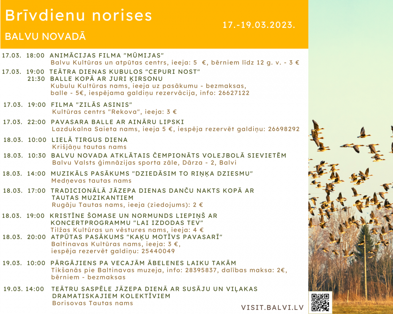 20:00 Atpūtas pasākums “Kaķu motīvs pavasarī” Baltinavas Kultūras namā, ieeja: 3 €, iespēja rezervēt galdiņu: 25440049.