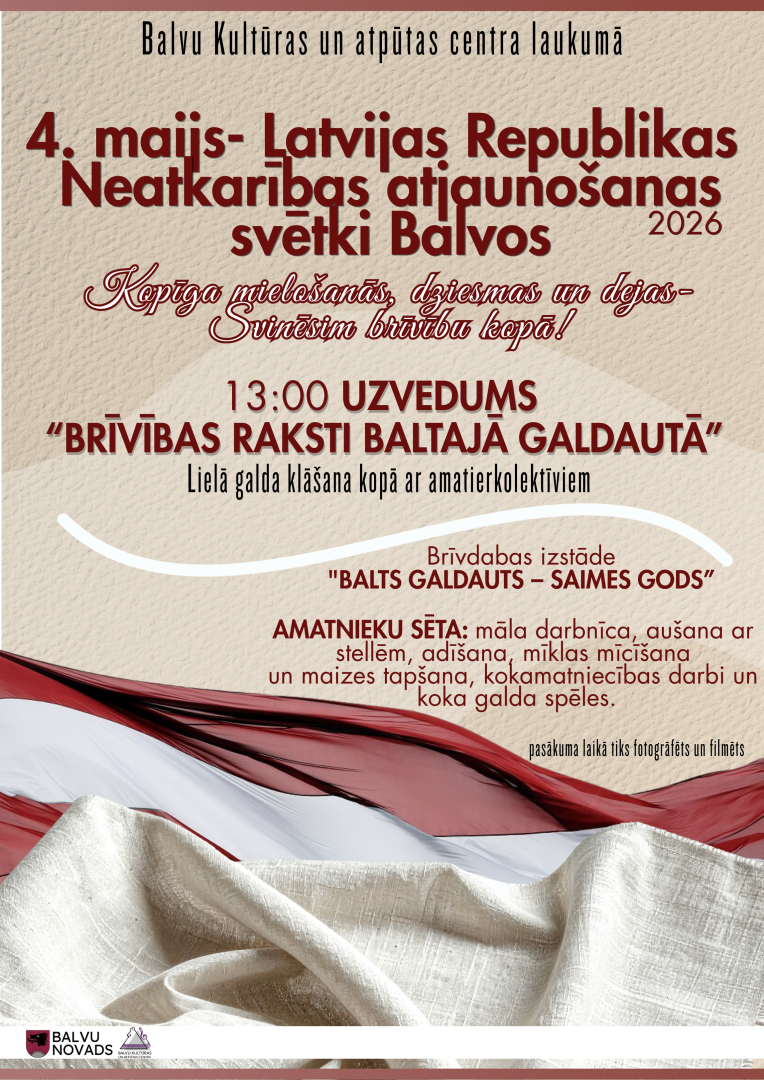 Latvijas Republikas Neatkarības atjaunošanas 36. gadadienu aicinām pavasarīgi patriotiskā noskaņā atzīmēt Balvu novadā! Pavadiet svētku laiku kopā ar ģimeni vai draugiem, baudot burvīgus koncertus un Balvu novada dabas skaistumu.