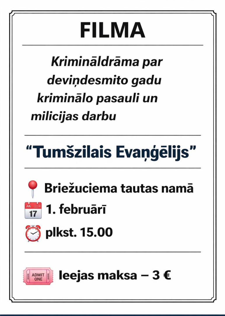 1. februārī plkst. 15.00 Briežuciema Tautas namā filma “Tumšzilais evaņģēlijs”.