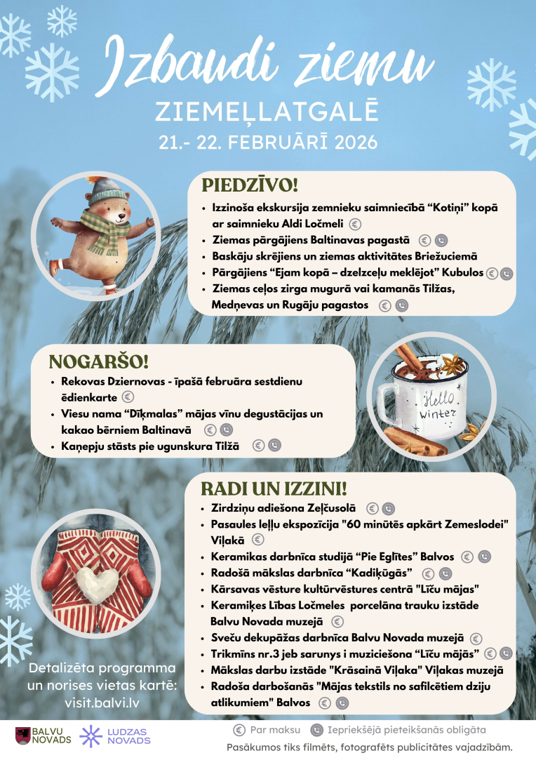Plānojot brīvdienas Ziemeļlatgalē, ņemiet vērā, ka apmeklējums iepriekš obligāti jāpiesaka vietās, kur tas programmā ir norādīts. Atsevišķas aktivitātes pieejamas tikai atbilstošos laikapstākļos! Publicējot fotogrāfijas sociālajos tīklos, aicinām pievienot tēmturus: #izbaudiziemuziemeļlatgalē un #ziemaziemeļlatgalē!