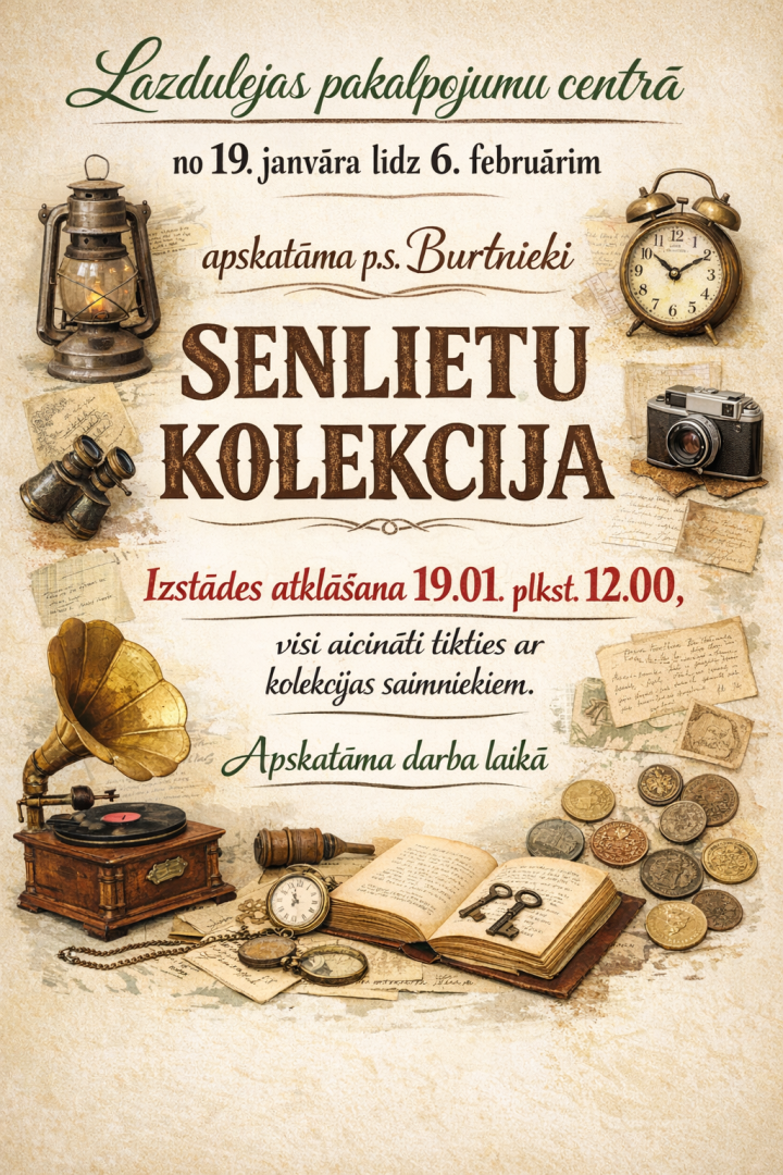 • No 19. janvāra Lazdulejas pakalpojumu centrā apskatāma p.s. "Burtnieki" senlietu kolekcija.