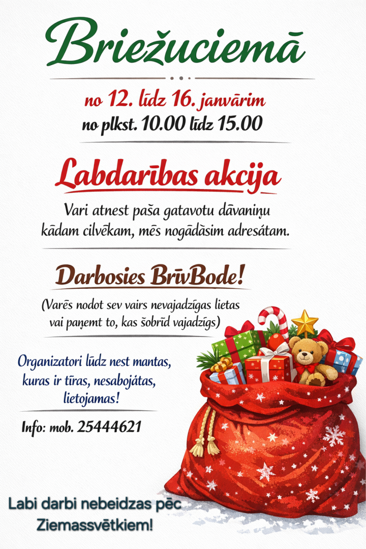 Laikā no 12. līdz 16. janvārim, no plkst. 10.00 līdz 15.00, Briežuciema Tautas namā norisināsies labdarības akcija – BrīvBode.