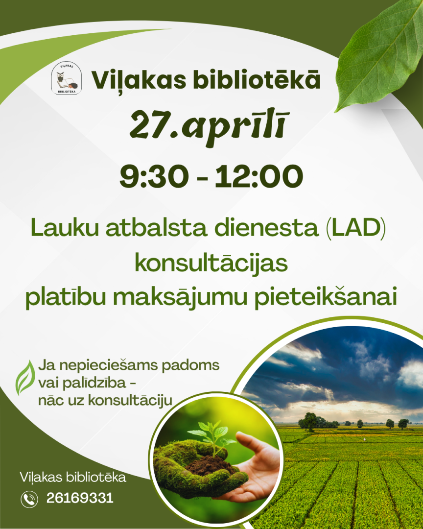 27. aprīlī no plkst. 9.30 - 12.00 Viļakas bibliotēkā Lauku atbalsta dienesta (LAD) konsultācijas platību maksājumu pieteikšanai.