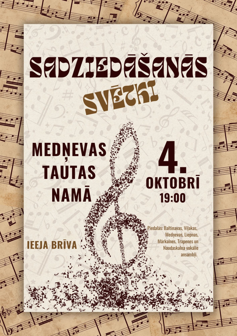 4. oktobrī plkst. 19.00 Medņevas Tautas namā sadziedāšanās svētki kopā ar Baltinavas, Viļakas, Medņevas, Liepnas, Mārkalnes, Trapenes un Naudaskalna vokālajiem ansambļiem.