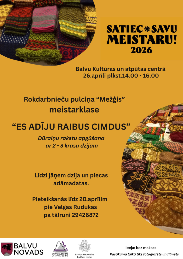 Šis ir informatīvs plakāts par rokdarbu meistarklasi.  Fons ir silti dzeltenā, sinepju tonī. Plakāta augšējā kreisajā stūrī ir apaļš attēls ar krāsainiem adītiem cimdiem – dažādi raksti un krāsas (zaļa, sarkana, rozā, dzeltena u.c.). Līdzīgs attēls ar daudziem adītiem cimdiem redzams arī apakšējā labajā stūrī.  Augšpusē lieliem, melniem burtiem rakstīts: “Satiec savu meistaru! 2026”