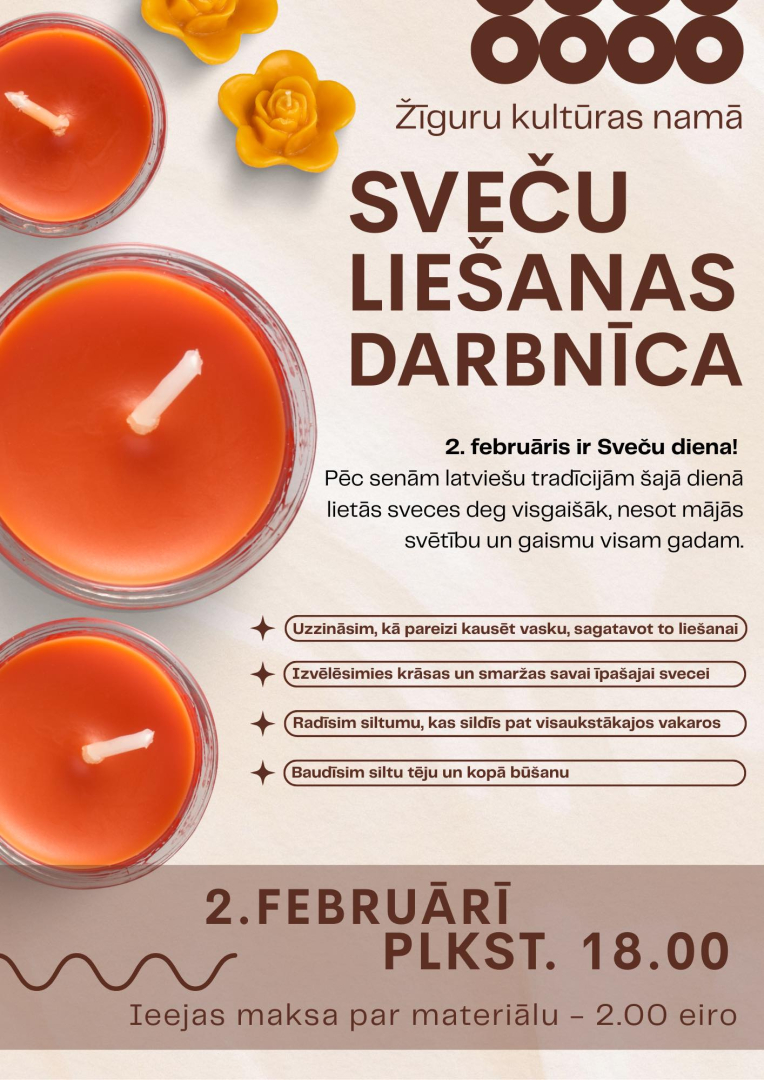 2. februārī plkst. 18.00 Žīguru Kultūras namā sveču liešanas darbnīca.
