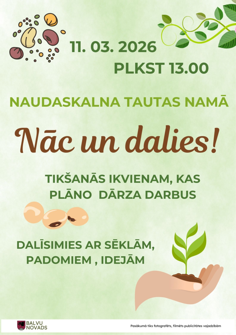 11. martā plkst.13.00 Naudaskalna Tautas namā tikšanās dārza draugiem "Nāc un dalies". Tikšanās ikvienam, kas plāno dārza darbus. Dalīsimies ar padomiem, sēklām, idejām.
