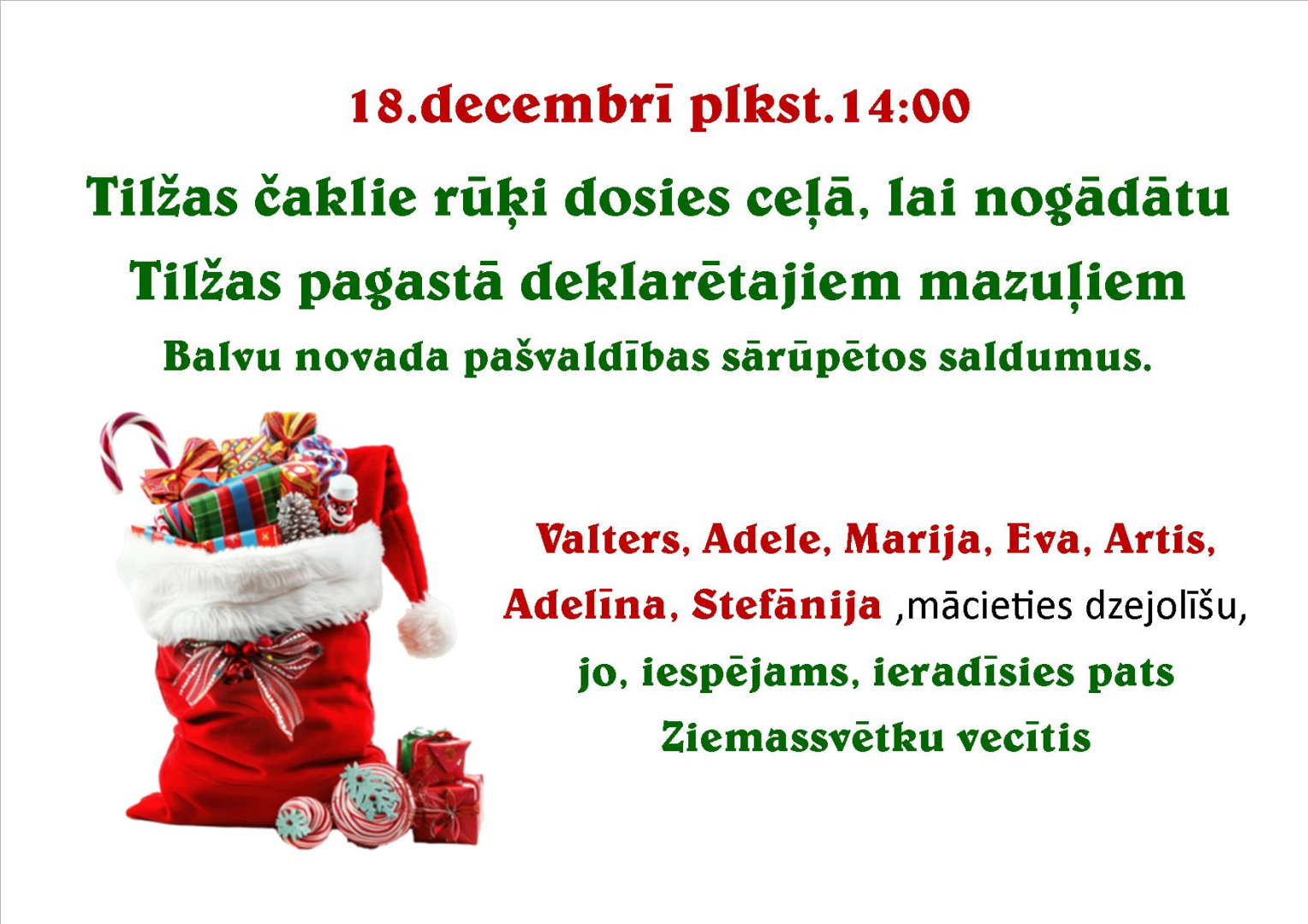 18. decembrī plkst. 14.00 Rūķi dodas uz tikšanos ar Tilžas pagastā deklarētajiem bērniem, kuri neapmeklē izglītības iestādes, lai saņemtu saldumu paciņu.