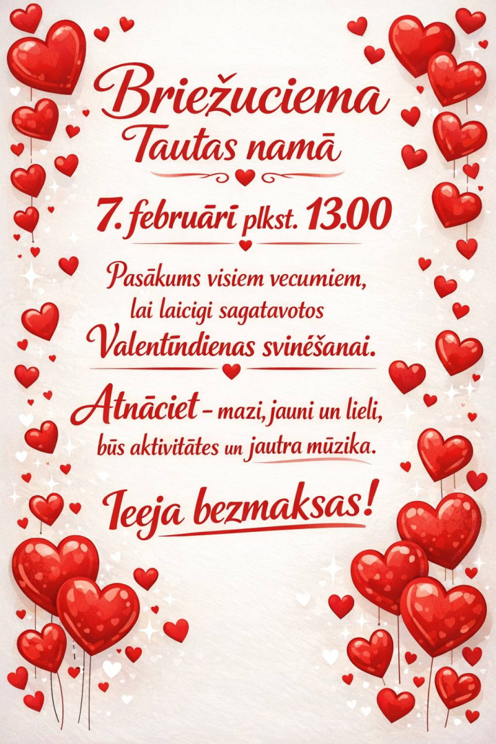 7. februārī plkst. 13.00 Briežuciema Tautas namā Valentīndienas gaidīšanas sirsniņballe - diskotēka ar aktivitatēm visiem vecumiem.