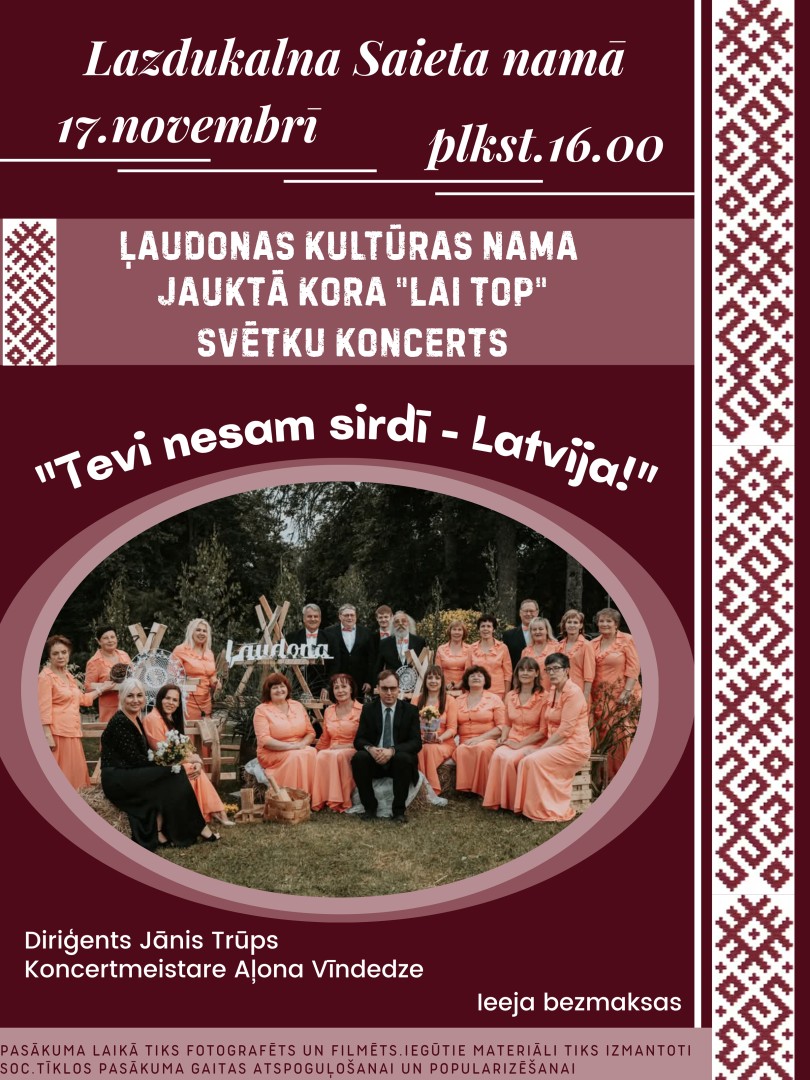 17. novembrī plkst. 16.00 Lazdukalna Saieta namā Ļaudonas Kultūras nama jauktā kora ''Lai top'' koncerts ''Tevi nesam sirdī - Latvija!'', diriģents Jānis Trūps, koncertmeistare Aļona Vīndedze.
