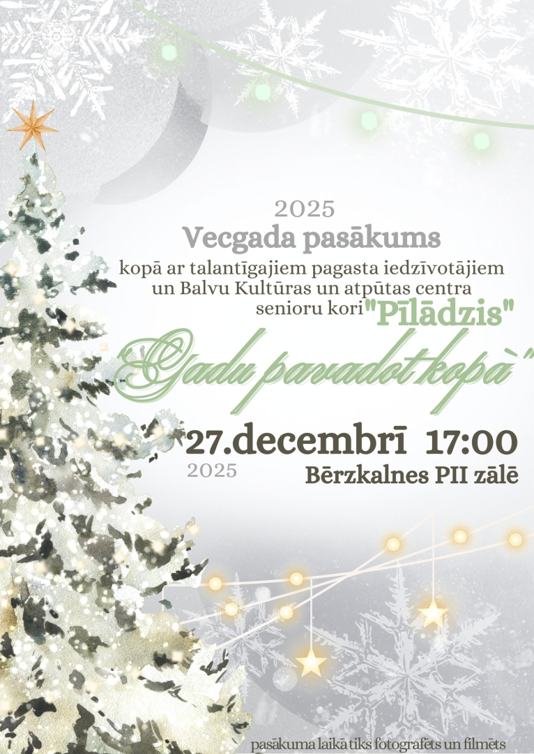 27. decembrī plkst. 17.00 Bērzkalnes pirmsskolas izglītības iestādes zālē - Vecgada pasākums "Gadu pavadot kopā" - koncertā uzstāsies talantīgie pagasta iedzīvotāji un Balvu Kultūras un atpūtas centra senioru koris "Pīlādzis".