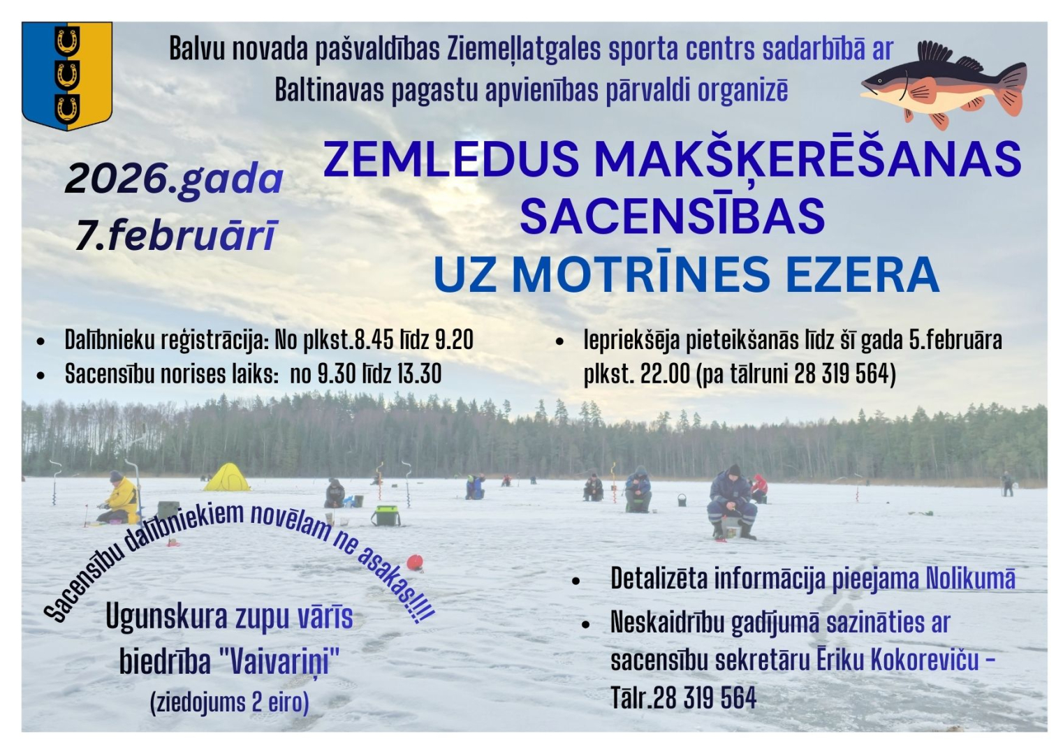 7. februārī no plkst. 9.30 - 13.30 Zemledus makšķerēšanas sacensības uz Motrīnes ezera.