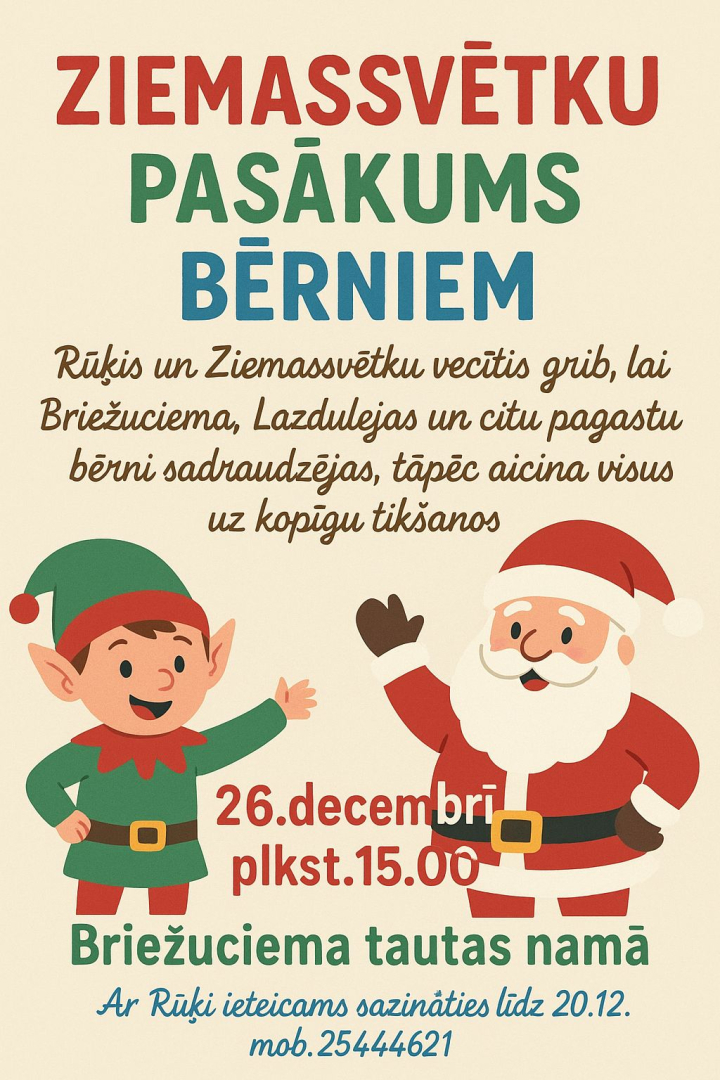 26. decembrī plkst. 15.00 Briežuciema Tautas namā. Ziemassvētku pasākums bērniem. Rūķis un Ziemassvētku vecītis aicina uz tikšanos Briežuciema, Lazdulejas un citus pagastu bērnus.