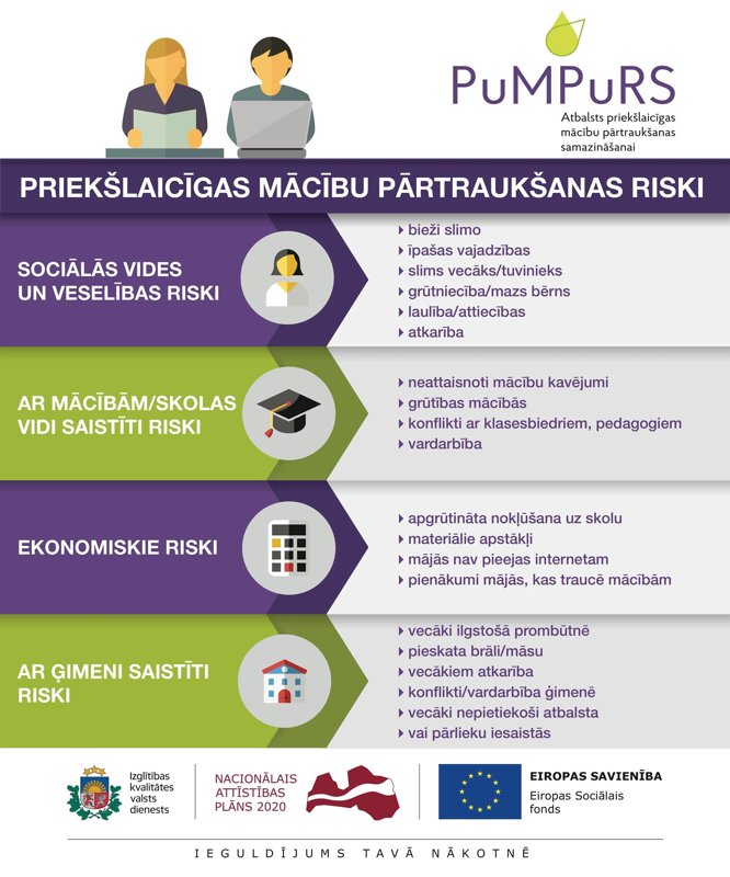 *Eiropas Sociālā fonda projekts Nr.8.3.4.0/16/I/001 “Atbalsts priekšlaicīgas mācību pārtraukšanas samazināšanai” (PuMPuRS) tiks īstenots līdz 2022. gada 31. decembrim. Projekta mērķa grupa ir vispārizglītojošo skolu skolēni no 5. līdz 12. klasei, kā arī profesionālās izglītības iestāžu audzēkņi no 1. līdz 4. kursam. Projektu īsteno Izglītības kvalitātes valsts dienests sadarbībā ar pilsētu un novadu pašvaldībām un valsts profesionālās izglītības iestādēm.