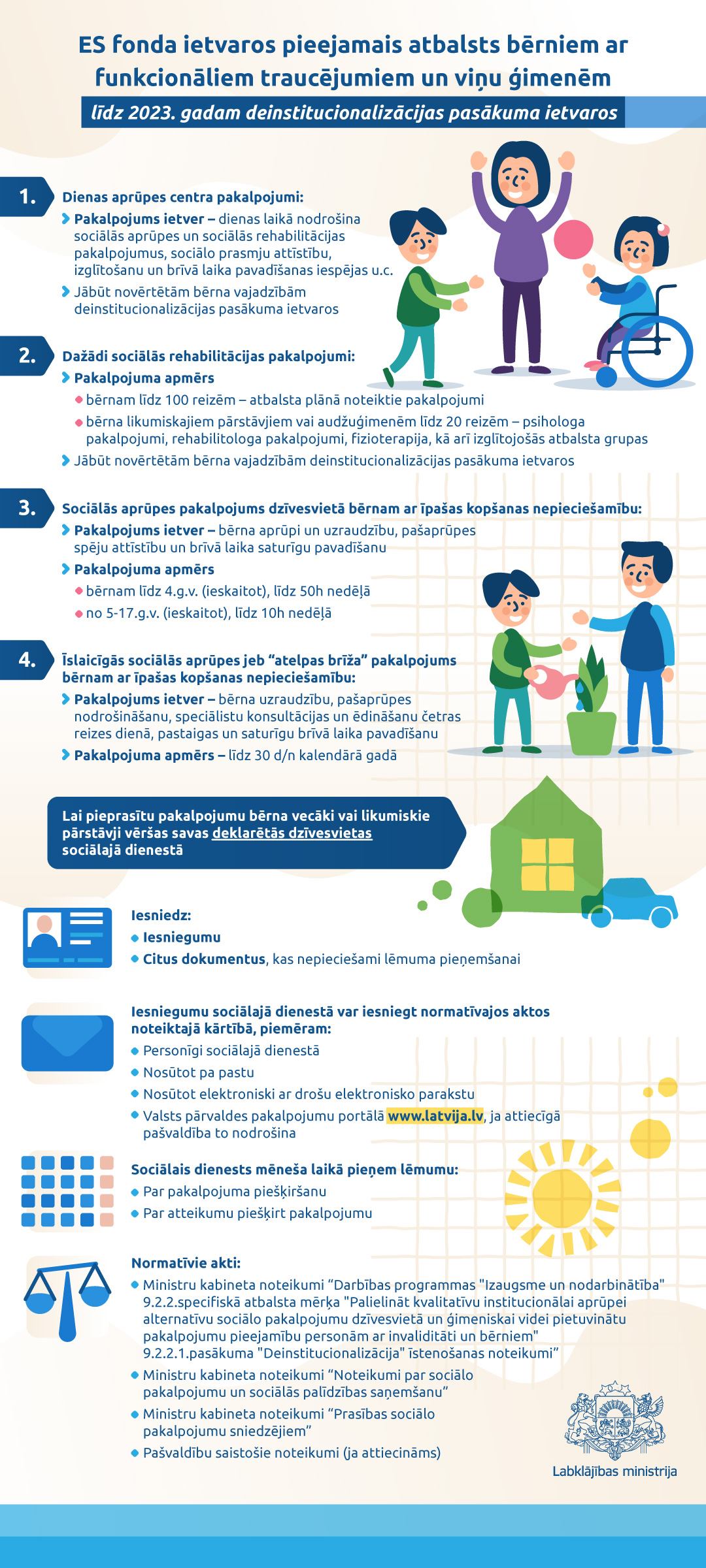 Līdz 2023. gadam deinstitucionalizācijas pasākuma ietvaros ar ES fondu finansiālu atbalstu pieejami dažādi pakalpojumi bērniem ar funkcionāliem traucējumiem un viņu ģimenēm.